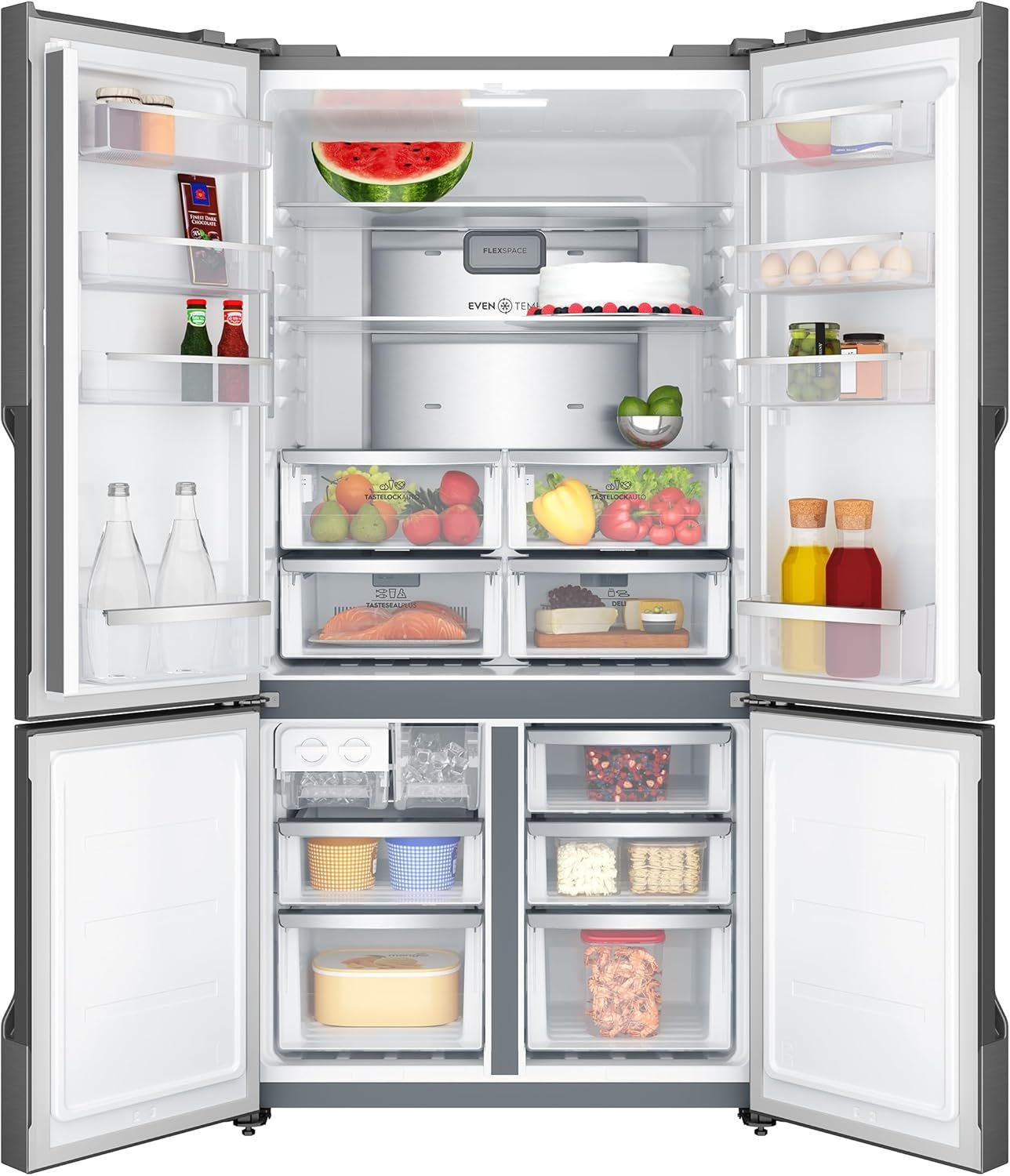 - Spacious 4-Door Design & Generous Capacity: With a refined four-door French-door layout and an expansive 634 L gross (562 L net) capacity. the Electrolux EQE5600A-S offers exceptional storage for a large household—keeping groceries and beverages well-organized and easily accessible. while its sleek stainless steel finish enhances any contemporary UAE kitchen.